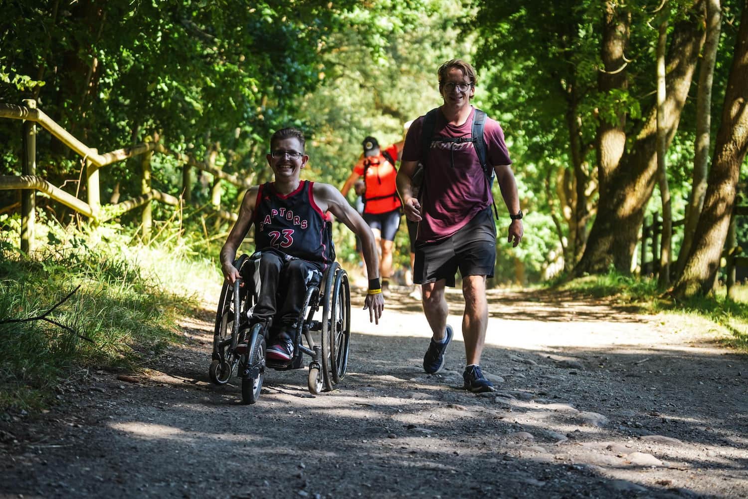 Die ersten 15 Kilometer liefen erstaunlich gut. Die Stimmung war top, Marcus’ Hände fanden ihren Rhythmus am Rollstuhl, Jacob ging nebenher und half, wo es nötig war.