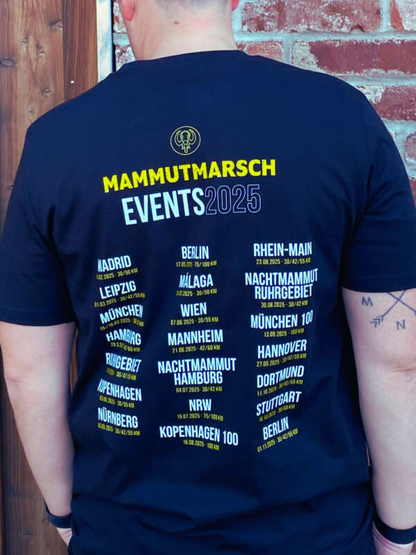 Die Rückseite ist das Highlight: Alle Mammutmarsch-Events des Jahres mit ihren Daten und Distanzen, wie ein Tour-Shirt für deine Abenteuer-Saison.